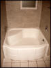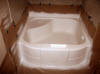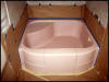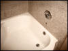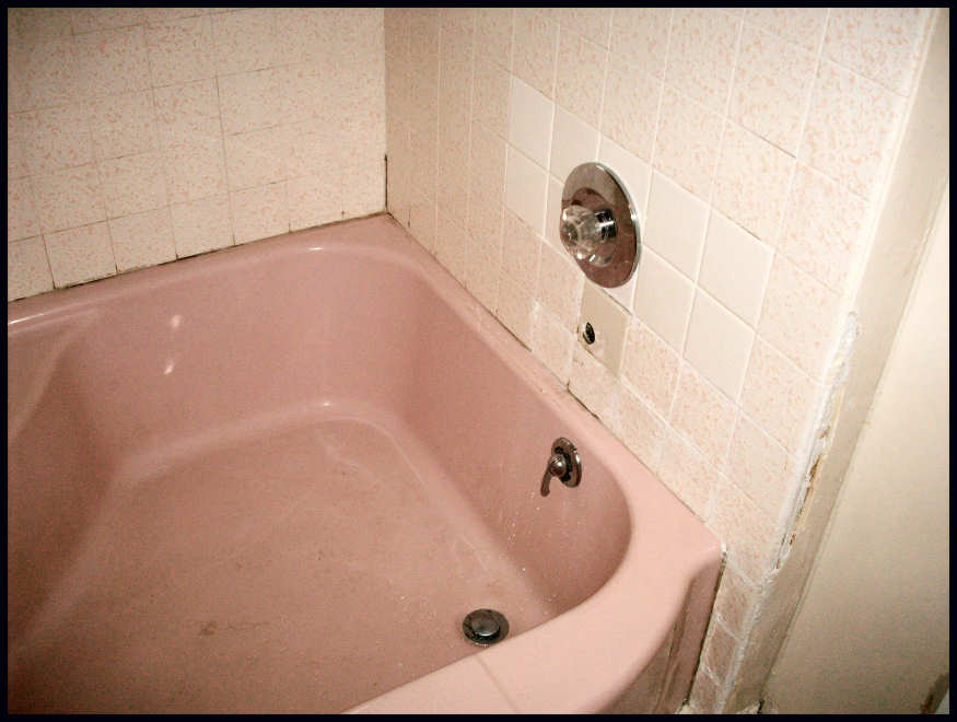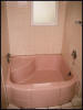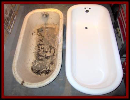 Bathtub like new! Here the bathtub has just received its new bright white finish. Goodbye pink! Notice how the overspray footprint is very small-- no need to worry about making a mess all over your bathroom! |
