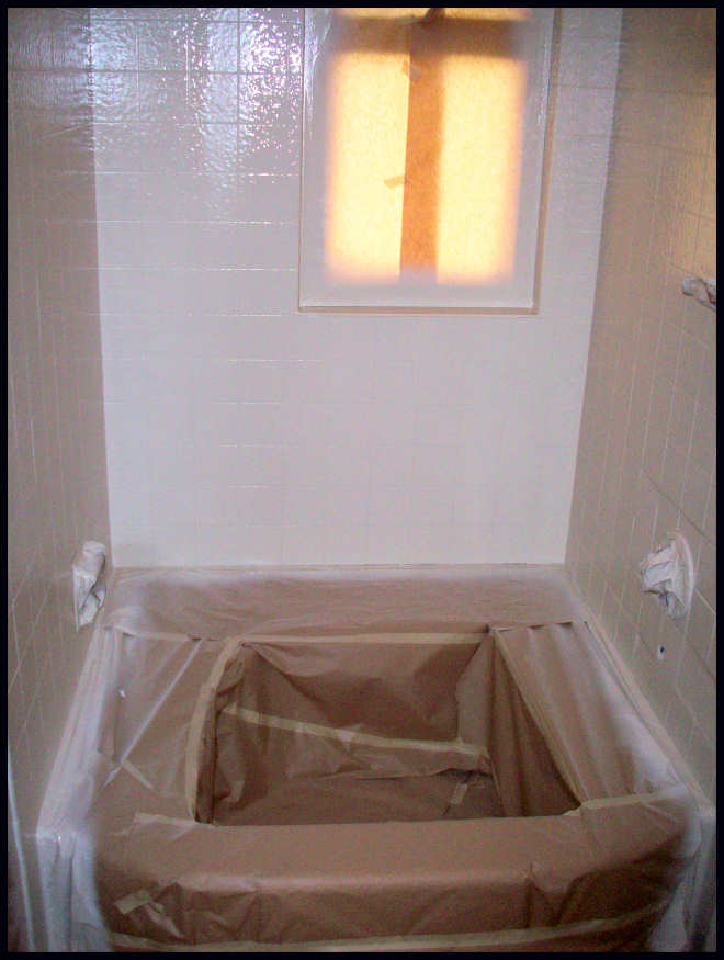 Bathtub Masking: The tile is done and cured, one day later, I returned and masked around the tub to refinish it in white as a second step. |